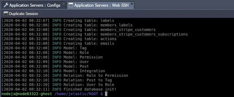 9. Connect to your Node.js server via Web SSH and run the following commands one by one to configure the database migration tool for knex (a query builder for MySQL):