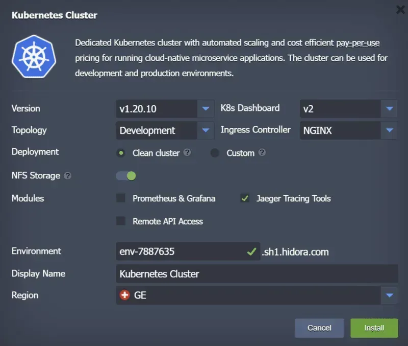 4. Cliquez sur Installer et en quelques minutes, la plateforme Hidora Cloud configurera automatiquement votre cluster Kubernetes.