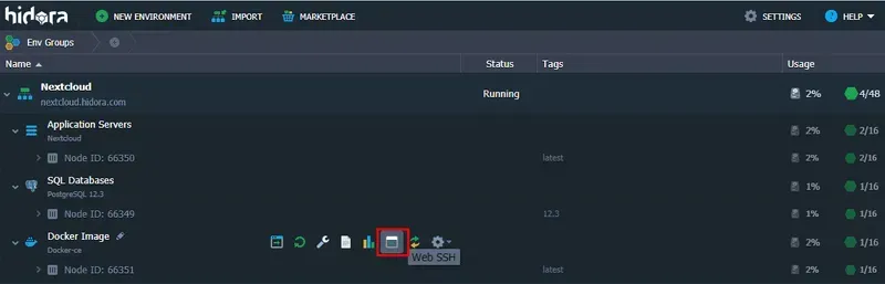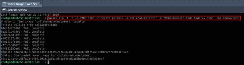 Une fois la connexion établie, exécutez la commande suivante afin d’installer Collabora Online Office dans le conteneur Docker-ce, que vous avez ajouté précédemment.docker run -t -d -p 9980:9980 -e “extra_params=–o:ssl.enable=false” -e “domain=nextcloud.hidora.com” collabora/codewhere parameter “domain=nextcloud.hidora.com” est le domaine de votre application Nextcloud.