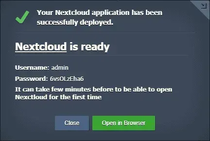 - Dans quelques minutes, le processus de déploiement sera terminé. Vous verrez la boîte de dialogue avec les informations d’identification de l’administrateur Nextcloud et le lien vers l’application. Cette information sera également envoyée à votre email.