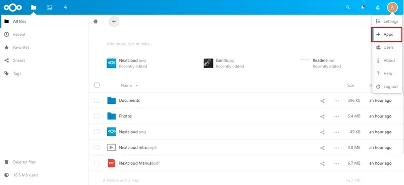Allez dans le tableau de bord Nexcloud et cliquez sur le bouton +App.