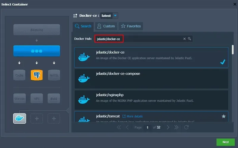 Cliquez sur Docker Image… et ajoutez l’image du serveur d’application jelastic/docker-ce. Cliquez sur le bouton Suivant après cela.