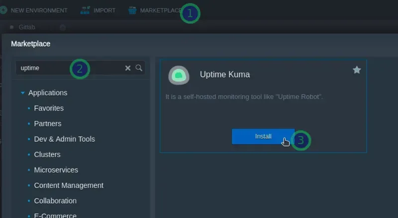 Catégories de l’application. Dans notre cas, Uptime Kuma est situé dans la section dev-and-admin-tools de la place de marché.