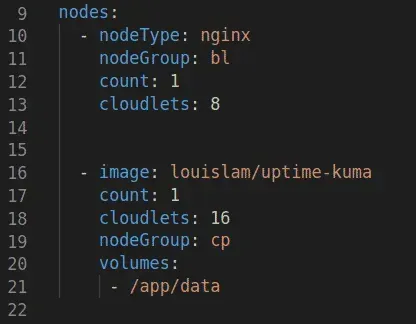 - La seconde est une image docker provenant de docker hub appelée louislam/uptime-kuma avec 16 cloudlets et possède des volumes persistants (app/data).